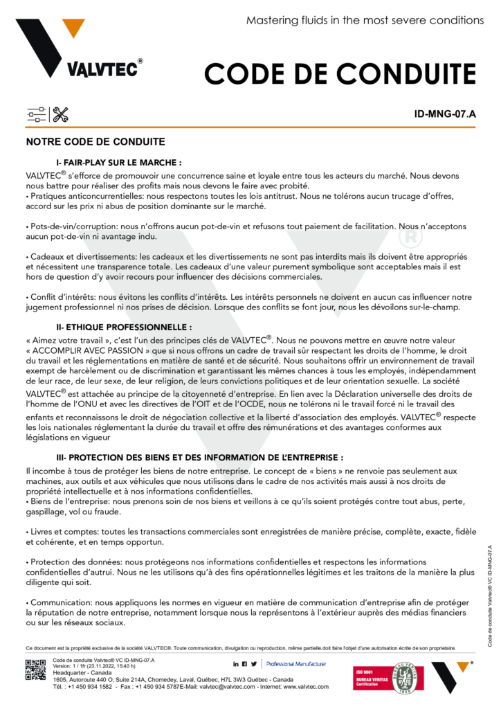 VALVTEC s’efforce de promouvoir une concurrence saine et loyale entre tous les acteurs du marché. Nous devons nous battre pour réaliser des profits mais nous devons le faire avec probité.